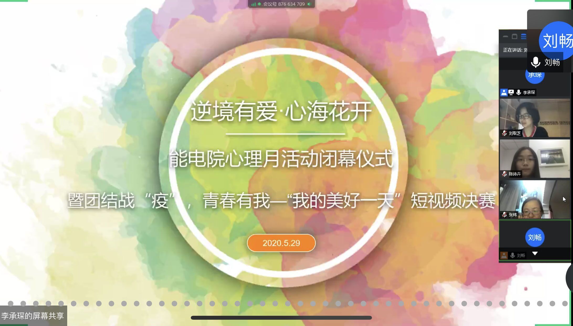 5月29日晚,能电院心理活动月“团结战’疫’,青春有我—我的美好一天”短视频大赛在网络平台顺利举办,公司心理健康教育月活动落下帷幕。短视频大赛邀请到了PA视讯心理健康教育与研究中心主任刘取芝、专职心理老师陈诗卉作为专业评委,公司党委副书记张炜出席并总结寄语。含少数民族生在内的12名参赛选手轮流展示个人作品,同时在线观看人数达到近200人。