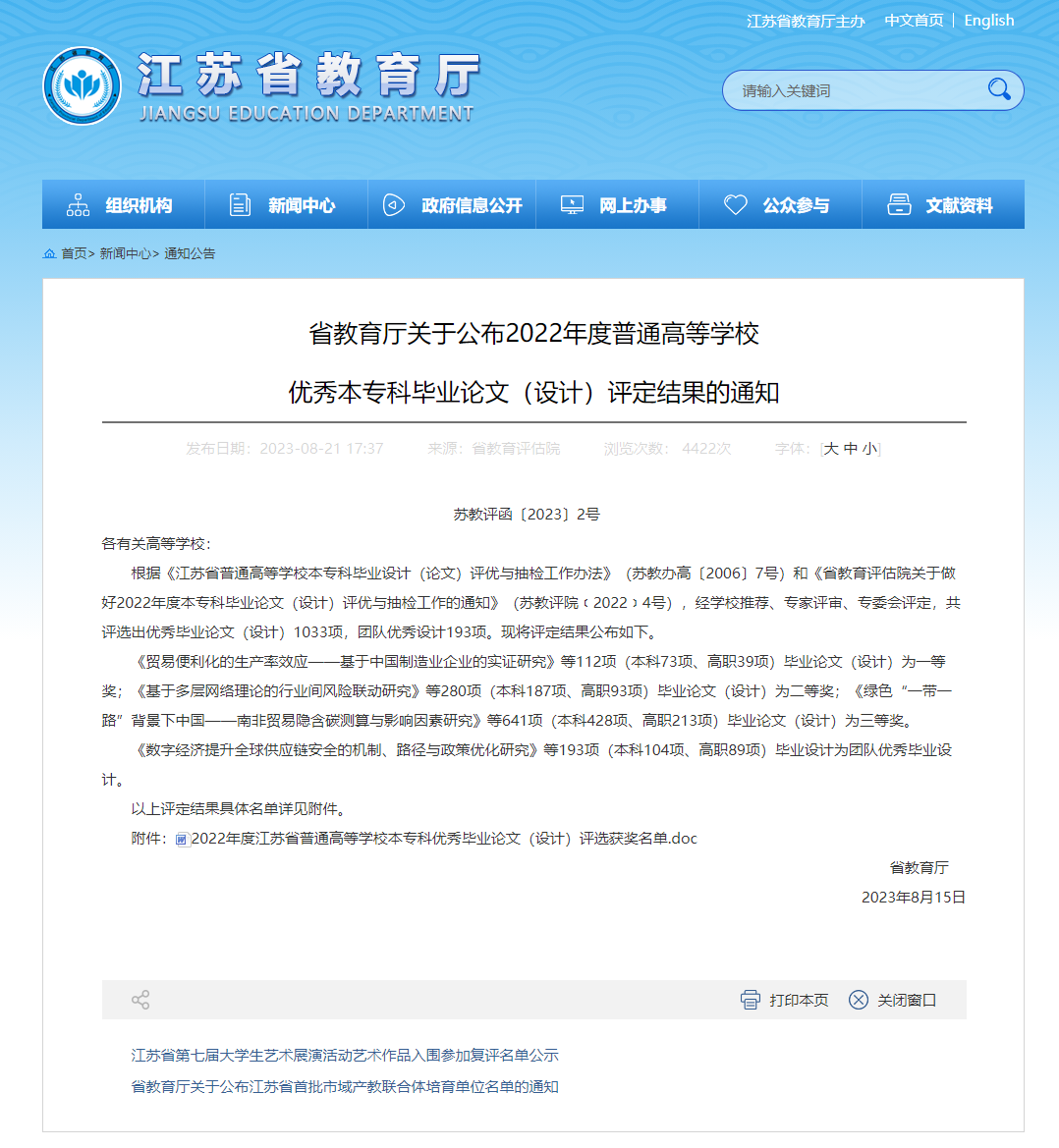 江苏省普通高等公司本专科优秀毕业设计(论文)的评选,是在高等公司择优推荐基础上,经省教育评估院组织专家评审选出,并由省教育厅审定。本次全省评选,PA视讯获一等奖4项、二等奖9项、三等奖2项以及团队优秀毕业论文(设计)3项,其中一等奖获奖数并列江苏高校第三名。