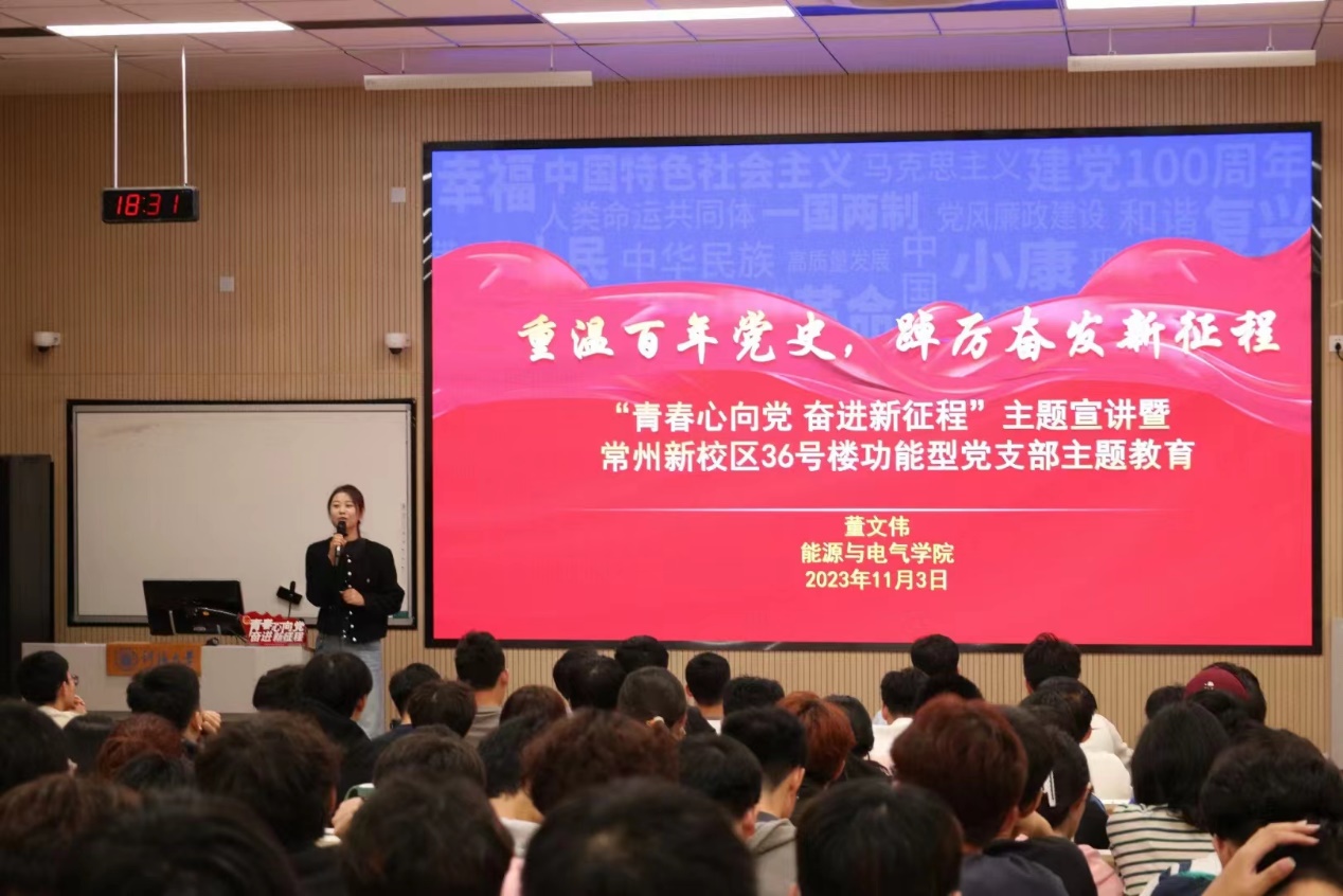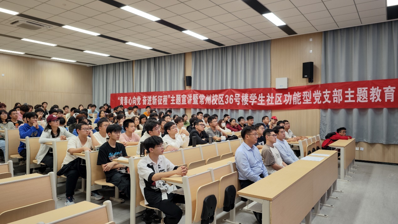 为深入学习习近平新时代中国特色社会主义思想,宣传贯彻习近平总书记在同团中央新一届领导班子集体谈话时的重要讲话精神,结合公司常州校区36号楼员工社区功能型党支部建设工作要求,公司于11月3日晚在常州金坛校区2号楼C110教室开展了“青春心向党 奋进新征程”主题宣讲暨常州校区36号楼员工社区功能型党支部教育活动。校后勤处副处长暨常州校区36号楼员工社区功能型党支部第一书记朱倬然老师、公司2022级本科生辅导员董文伟老师、2023级研究生新生和2022级100余名员工骨干参加本次活动。