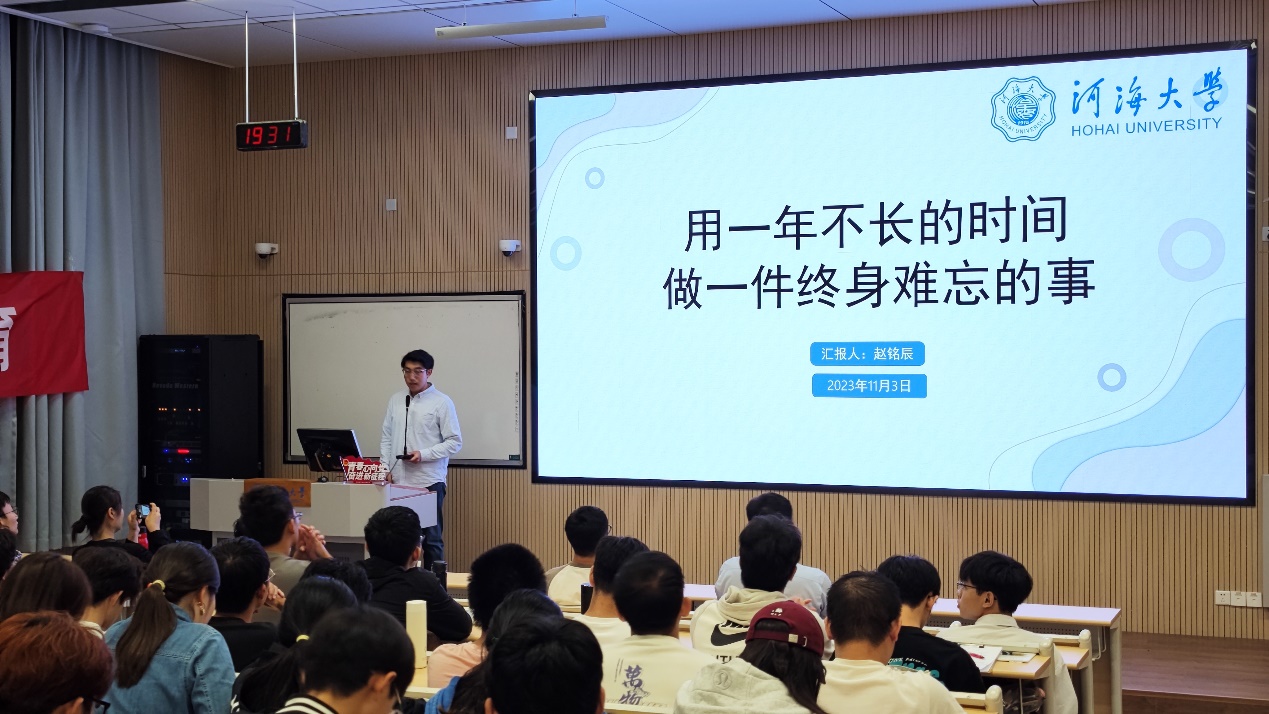 公司2023级研究生赵铭辰以《用一年不长的时间做一件终身难忘的事》为主题,讲述了他在秦巴山区难忘的支教回忆。从曾坐在教室中聆听学长关于支教经历的分享到受到启发而决定前往支教的初心,从本科阶段各项员工工作中的实践锻炼到石泉支教一年的成长收获,赵铭辰启发青年河海学子们将小我融入大我、用实际行动践行志愿精神,让青春在西部大地绽放绚丽之花。