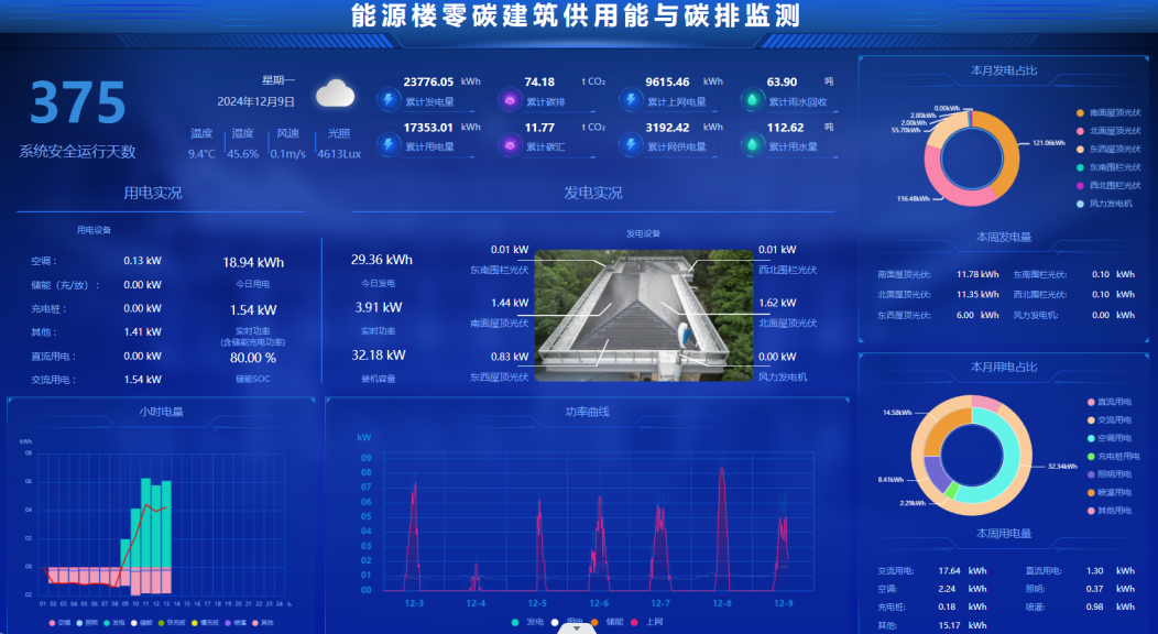本项目创新突破并集成应用了被动式节能+风光储建筑/景观一体化、风光储直柔+源网荷储多能互补的零碳建筑微电网(光储充用直流微电网、风光热储用交流微电网、交直流柔性互联微电网)、零碳建筑电/热/冷供用能全过程电碳协同(实时动态碳排计算)、基于用能互联网的互动交易等关键技术,研制建筑微电网能源网关、建筑能耗与碳排放管控平台,在PA视讯西康路校区进行既有建筑绿色低碳智慧用能改造,本体节能率75%,综合节能率135%,实现负碳运行,是首个智慧用能与建筑节能相结合的零碳建筑。
