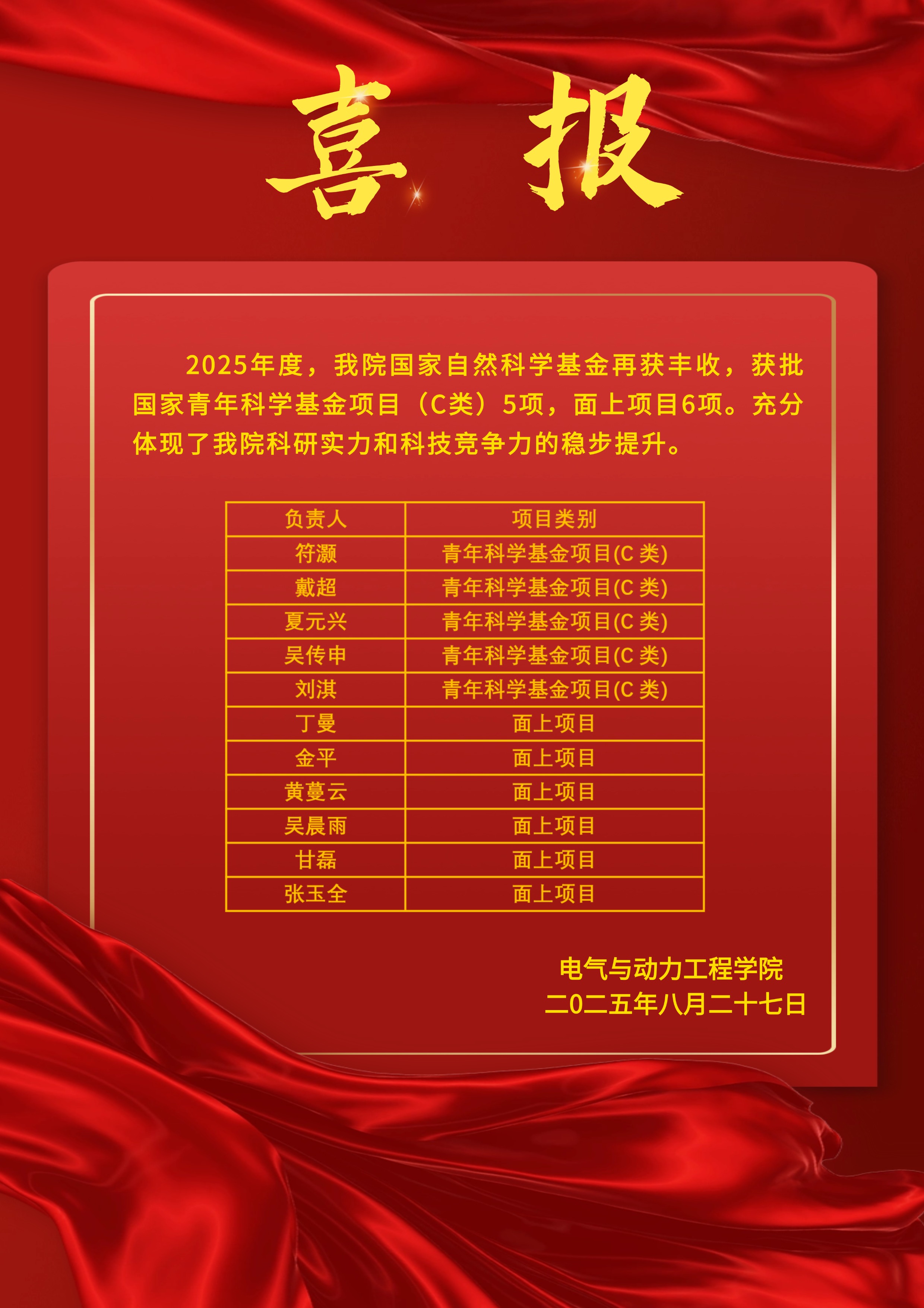 近日,国家自然科学基金委员会公布了2025年度项目评审结果。电气院本年度共获批项目11项。其中:面上项目获批6项,资助率17.6%;青C项目获批5项,资助率31.2.%。立项数量与资助经费创历史新高,彰显了公司雄厚的科研实力与创新活力。这一成绩的取得,是全院教师勤奋钻研、共同努力的成果,也是公司科研组织工作持续优化的体现。