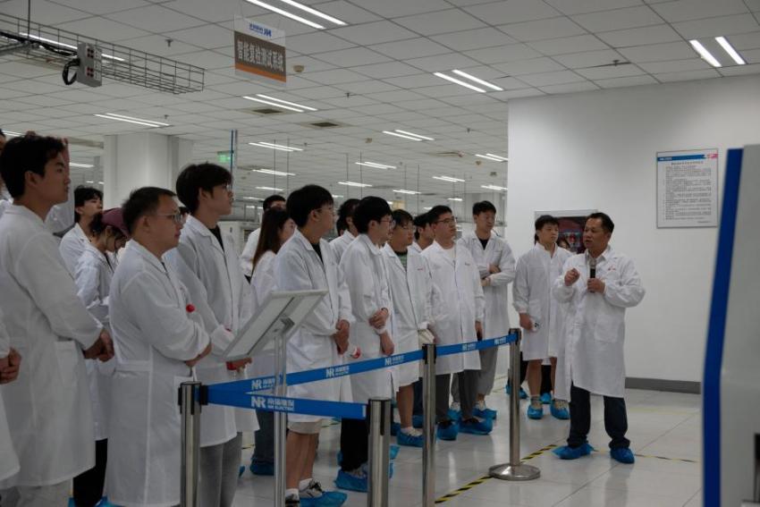 随后,同学们按要求穿戴好静电防护服,深入南瑞继保的自动化生产车间和研发测试区域进行参观。高度智能化的产线、严谨有序的工艺流程让同学们叹为观止。工作人员重点介绍了如“柔性直流输电”等代表世界顶尖技术水平的重大工程项目,也介绍了智能机械狗在内的前沿智能化产品的研发与应用场景。这场“零距离”的接触,让书本上的理论知识与鲜活的工业实践实现了深度融合。